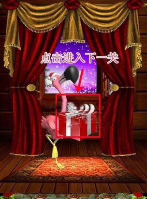将窗户打开之后,我们看见一只火烈鸟从窗户飞进来,捧着一份礼物,点击礼物进入下一关(如上图红框所示)。