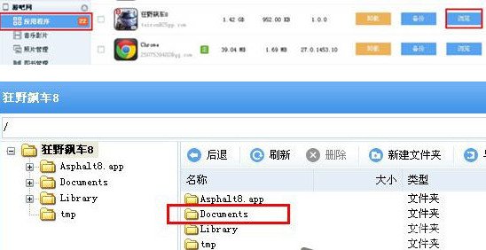 4、将电脑和IOS设备链接,使用PP助手找到对应的狂野飙车8的游戏安装目录。