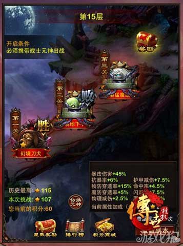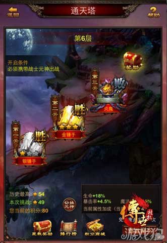 第四层的过关要求是战斗胜利后人物剩余血量大于百分之六十。第五层要求玩家25回合内战胜敌人。第六,七,八层则要求玩家必须携带元神出战,且每层元神出战顺序分别为战士,法师,道士,战斗胜利的条件是元神不能阵亡。