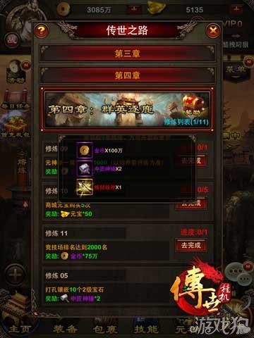 自第四章开始,勇士们已经成为中州真正的游戏老手,是时候进阶成为更牛掰的高手了。第四章涉及到竞技场、宝石镶嵌等,除了竞技场的排名任务和10个2级宝石的镶嵌任务,其他大部分任务都可跟随完成。