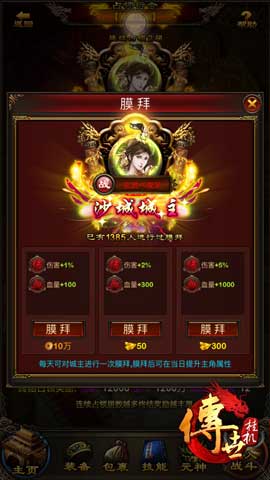 《传世挂机》沙城共设有城门争夺战、皇城外围争夺战、皇城争夺战三大血战阶段。城门争夺战是战略资源抢夺的关键,四个BUFF据点同步启动争夺,占领越多,行会所享受到的伤害、暴击、血量、闪避等BUFF加成越多,同时,随机分组的5V5混战模式也将带来精彩无限。皇城外围争夺战中也设有四个据点,但和第一阶段有所不同,这里采用单人VS单人的限时抢夺的模式,同时元神也可加入战斗,但是战斗死亡就会被淘汰出局。皇城争夺战是沙城的封王之战,攻守双方将在皇城内展开最后的生死之战,胜利一方将荣登沙城城主宝座,受万人膜拜,享豪情沙城奖励,并斩获独一无二的“沙城城主”荣誉称号。