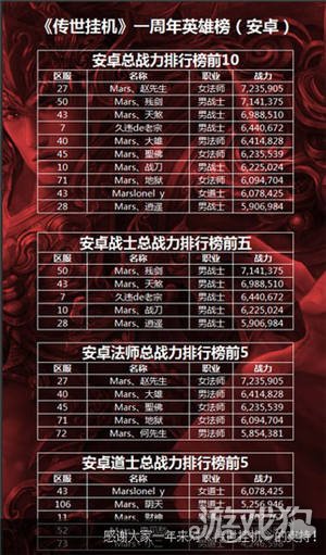 在此次《传世挂机》的一周年之际,众多行会兄弟在贴吧自发发起周年追忆之旅,带领新老玩家一同回忆过去一年的点点滴滴,其中Mars家族的周年纪实让人印象尤为深刻。从一年前Mars家族开始进入游戏之初,从零开始招募成员组建公会,到成员开始壮大形成管理制度,再到公会中涌现出一些在《传世挂机》世界中声名显赫的勇士。Mars家族为大家带来的不仅仅是辉煌的个人成绩,更是整个公会的荣耀成长之路。而这一路让他们凝聚起来征战始终的,就是是公会成员对《传世挂机》的热爱和成员们之间纯粹的兄弟情!