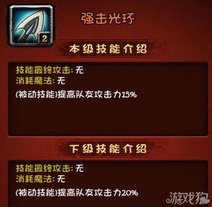 在2级的【强击光环】下队伍里面所有五个英雄直接提升面板攻击力的15%,进而提高技能输出。既进入战斗之后所有英雄的攻击力都会变为115%。