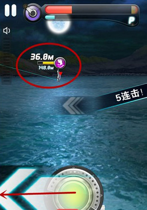 在钓鱼模式中,看到鱼跳出海面的时候,应该果断拽线,就是按住鱼竿的按钮向箭头方向滑动。这样可以趁着鱼跳出水面的时机,将鱼的距离大幅拉近,这样就能避免鱼游得太远将该装备弄断了。