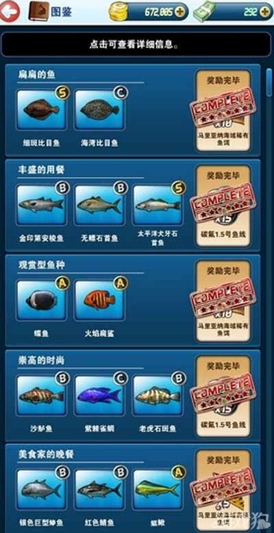 钓鱼发烧友中鱼类图鉴的奖励,是可以领取多次的,只要玩家能钓到更大等级的鱼,完成更高级别的鱼图鉴就可以领取更多的奖励了。D级的鱼图鉴可以领取当地的鱼线,C级的能领取金币,B级的则是鱼饵,而A级的也是金币,S级的就是汽水了。 不管玩家完成什么样的组合,能得到的奖励都是按照这样的顺序发的。区别只是奖励的多少而已,所以当我们缺少鱼饵和鱼线的时候,可以去鱼图鉴中都领取了。不然到了后期,这些东西都会变成没用的废物,所以及时使用也是很关键的。