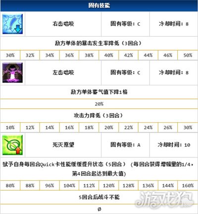 小安的一技能能够减少敌人的暴击发生率,虽然只是单体技能,但也能减少很多的输出。二技能敌方单体的蓄气值减少一格,攻击力下降,能十分有效地削弱敌方输出,而且是必中的效果。三技能是非常特殊的技能,能够增幅恐怖的绿魔放,增伤会非常多,而且回合持续的非常久,足有5个回合,但是在使用死灭愿望会在五回合后触发自身即死。