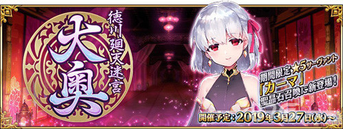 而这次的活动舞台就是德川的大奥,幕府的后宫,并且还变成了迷宫。实装的五星从者为印度爱神伽摩,凭依了黑樱的身躯。