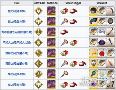 自由关卡:狸之间(狸の間)、狐之间(狐の間)、海市蜃楼之间(御道具集め 蜃気楼の間)、不知火之间(不知火の間)、薄暮之间(夕闇の間)、黄昏之间(宵闇の間)、隼之间(隼の間)、枭之间(梟の間),下面附上自由本掉落表: