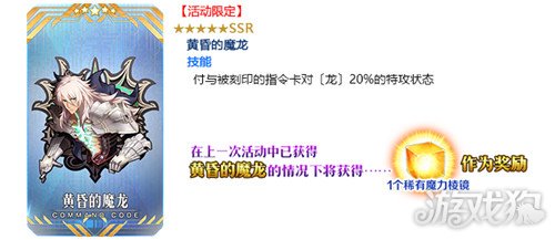 fgo黄昏的魔龙怎么获得?fgo黄昏的魔龙获取方法。万圣节四期活动玩家可以获得3~5星纹章各一张,这是其中的五星纹章。龙性特攻的泛用性不如闪闪的从者特攻,但是在打巨龙的时候很好用,可以给打手备一个。 纹章获取方法: 「神秘之国ONILAND!!」活动中作为活动奖励获得。 以上就是黄昏的魔龙的获取方法了。
