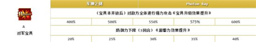 红色的光炮宝具可以配合两张红卡组成三红,宝具本后一宝倍率由300%提升至400%,OC效果——敌方全体防御力下降三回合也由