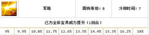 非常符合要求一发清场的光炮定位的技能,全队伍BUFF有稍许辅助性,但一般捆绑自身宝具施放,技能升级需要消耗较难入手的爪子和心脏使得