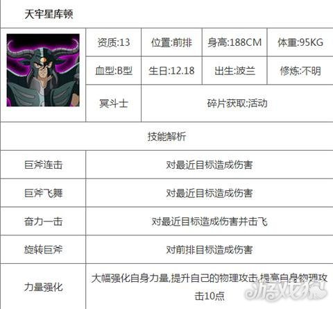圣斗士星矢重生天牢星库顿有什么技能?库顿怎么获得?天牢星库顿是一个前排圣斗士,很多玩家想知道库顿值不值得培养,小编带来了天牢星库顿的技能介绍和实测点评,给大家做个参考。 点评: 只有活动才能获得的斗士,土豪才能用的起的斗士,比起通过常规方式获得的斗士强一些。