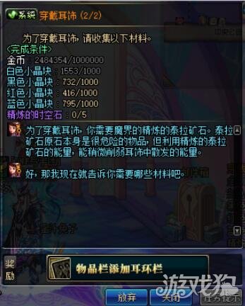 DNF耳环任务材料需要哪些详析讲解,dnf已经更新了90级版本,在这个版本中新加入一件装备,那就是耳环,想要知道耳环任务怎么做的玩家一起来看看吧。 耳环装备任务 玩家在等级达到90级时,可以接受穿戴耳环任务(1/2): 需要分别通关勇士级的兽人峡谷和红色魔女之森各1次。 穿戴耳环(2/2),需收集以下材料: 精炼的时空石可以用副本里掉落的材料时空石在npc红色魔女处兑换精炼的时空石。获取难度低 耳环和辅助装备与魔法石都为特殊装备,圣物有2,3套装属性。