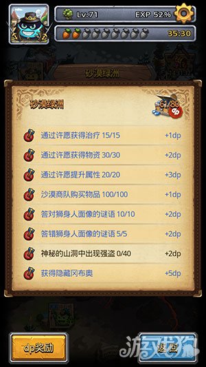 在沙漠绿洲中,玩家可以获得各种灯油,许愿可以获得各种道具奖励和属性加成,不过如果只是为了拿隐藏和后续的碎片的话,就没必要老许愿了,浪费时间。神灯冈布奥是玩家使用圣灯油许愿后对话请求对方加入即可。不过圣灯油需要玩家击败70层的BOSS之后才能获得,所以玩家想要获得神灯,需要保底爬到70层。