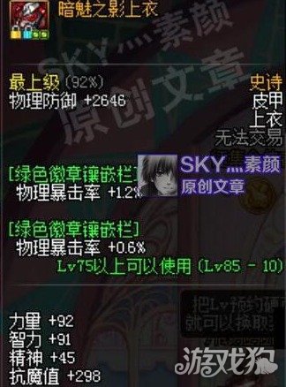 [上衣:暗魅之影上衣]:基础力量智力较高,背击时有1%几率进入伪装,黄字伤害+18%