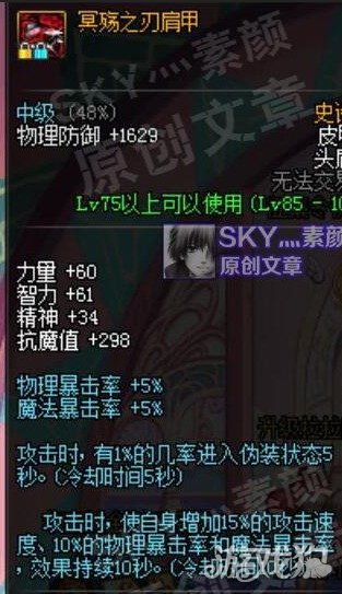 [头肩:冥殇之刃肩甲]:双暴+5%,攻击时1%几率伪装,攻击时攻速+15%、双暴+10%,持续10S冷却10S