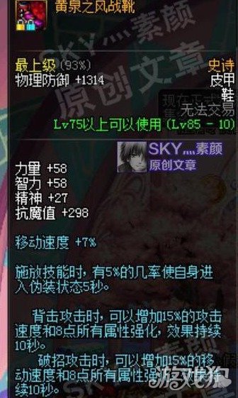[鞋子:黄泉之风战靴]:施放技能5%几率进入伪装,背击时攻速+15%、全属强+8,破招时移速+15%,全属强+8