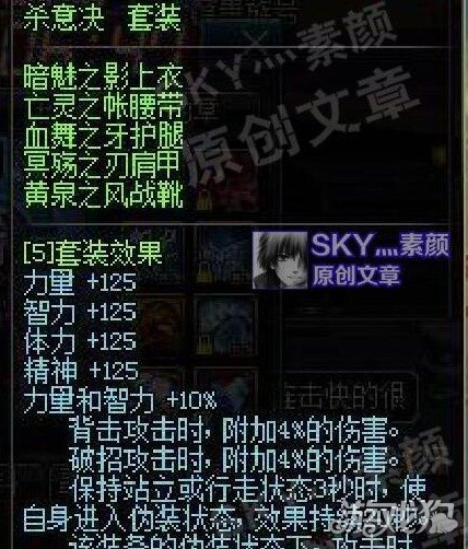 背击有1%几率进入伪装,是为了配合套装的伪装白字效果。总之杀意上衣是一件不错的散搭装备,但使用的时候注意黄字冲突。