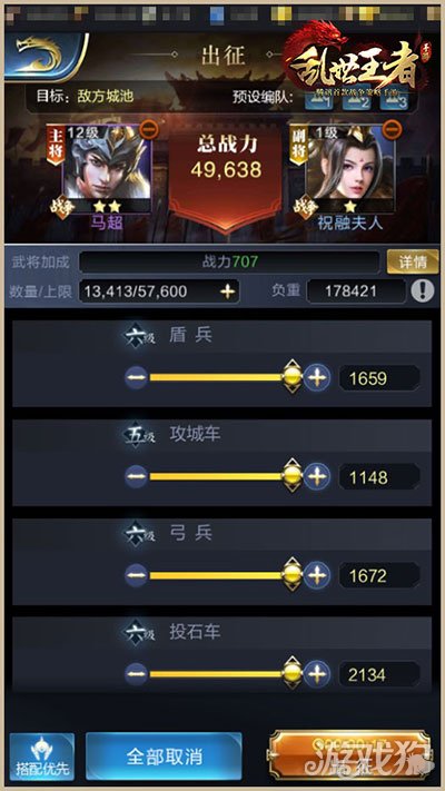 在进攻时我们要派遣武将来领导整个军队,所以选择正确的武将非常重要。武将一共分为战争、发展和辅助这三方面,战斗时当然要选择适合战争的武将,才会获得比较高的战力加成。如果选择发展型的武将就略有偏颇了,毕竟明智的君主都要懂得因才适用的道理。前期游戏中获得的马超就非常适合当先锋,我们可以派遣他作为主将,副将可以派遣已有的战争型武将。