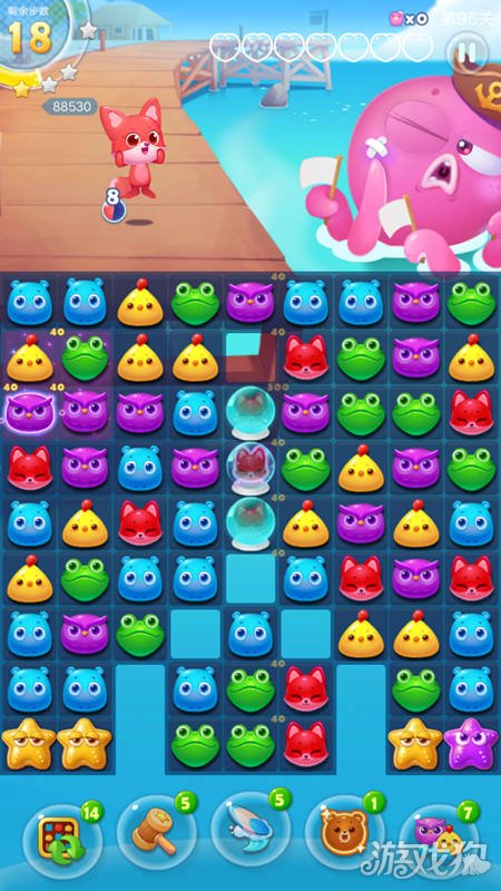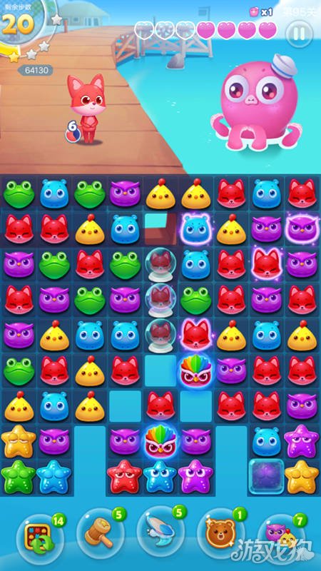 海滨消消乐95关的任务目标是打败两只章鱼。这一关开局先打冰块,消掉冰块狐狸水晶灯两边各有五列小动物,而没消掉之前只有三列。有了足够的空间才方便组特效,用特效组合开道才有可能拿更高分。狐狸灯不需要特意去打,组到特效自然就打到了。如果为组特效而专门去打狐狸灯只会本末倒置,白白浪费步数。下面我们一起来看一下海滨消消乐95关的攻略吧。