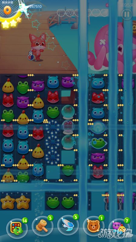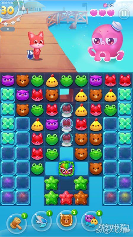 之后就可以努力消除小狐狸让小狐狸不断释放大招,小狐狸释放大招之后会发出小蝴蝶,小蝴蝶会让下面的海星变色,海星有三层,每次与同色小动物匹配后可消除一层并变色,海星被消掉后可对章鱼造成大量的伤害了。另外左下角和右下角的冰块里也有海星哦~也可以充分利用。