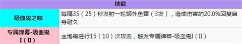 2、技能:吸血鬼有两大技能,即吸血鬼之吻以及专属弹幕,其中前者效用为每隔一定时间额外发射鱼雷,造成的伤害一定比例转换为耐久;后者主炮攻击限定次数触发专属弹幕。