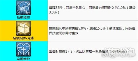 2、技能:明石有三个技能,即后勤维修、定期维护以及装填指挥,三者的作用皆为辅助型能力,能够在实战中为队伍提供有力的支撑和保障,是相当值得玩家入手的一款舰娘。