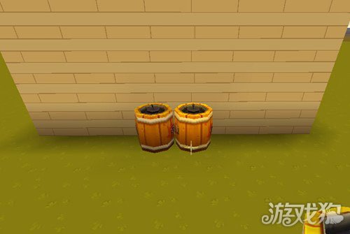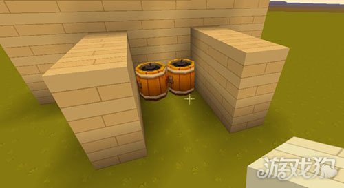 1.在自己搭建好的房子墙角,我们放置两个炸药桶,如图所示,难度为0。