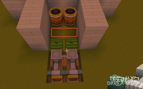 3.在炸药桶距离间隔一格前方的空地,放上并列的两个生物感压板。再在生物感压板前面各挖个两个坑,在坑里面放置两个投掷装置即可。如图所示。