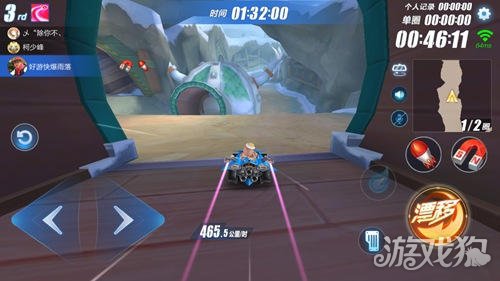 在隧道出口可以看到左侧有一个小隧道,右侧则是露天赛道,这里一定要注意,不管是向左侧还是向右侧都可以,千万不能从中间冲过去,否则会撞到小隧道的墙壁。