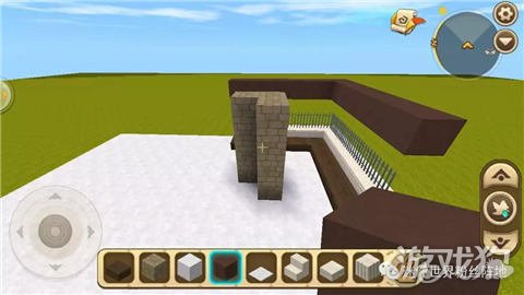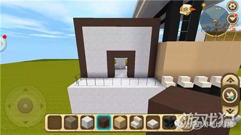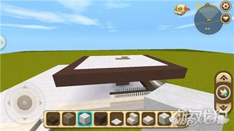 我们在铁栏杆上方留一格用棕色硬沙块对准图片棕色方块的位置围起来,再在图片中对应的位置上做一个柱子,之后就将这个顶部填满白色硬沙块;