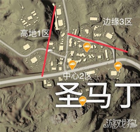 为方便小伙伴们阅读,小编将“圣马丁”分为3处区域:1区是高地区,2区是中心区,3区为边缘区。高地1区建筑稀少资源量一般,但却占得了居高临下的“地形优势”。中心2区是资源最为肥厚的区域,也是小编推荐的落地区域。3区是点位的边缘区,与高地1区在搜刮物资装备方面都没有什么太大优势,中后期的卡点卡位却方便许多。