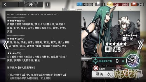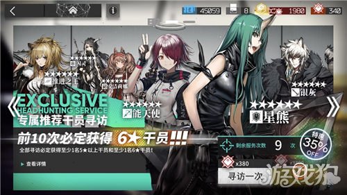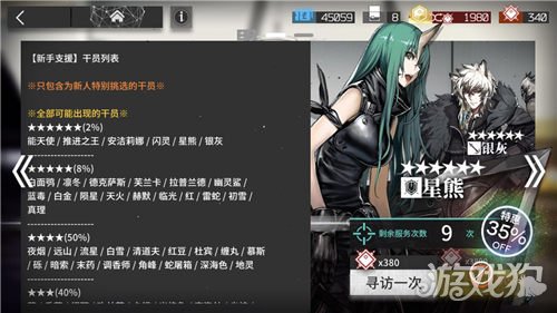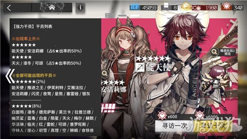 寻访一次需要380的合成玉,而且第一次抽还有优惠。在新人卡池中6星干员有2%的几率会出现,且只会出现下面这些6星:能天使、推进之王、安洁莉娜、闪灵、星熊、银灰。除此之外卡池里的干员如下图所示: