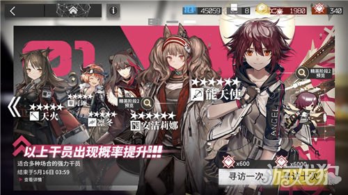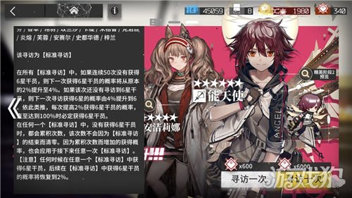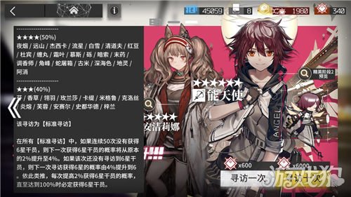 红色的卡池则是标准寻访,这里有一个活动就是有四个干员出现的几率上升了,他们分别是六星干员能天使和安洁莉娜,以及五星干员天火、凛冬和可颂。他们出现的几率都会占各自级别的50%,意思就是如果抽到六星或者五星,极大的概率会是上述这四个干员,但并不是六星干员出现概率提高,这个要分清。