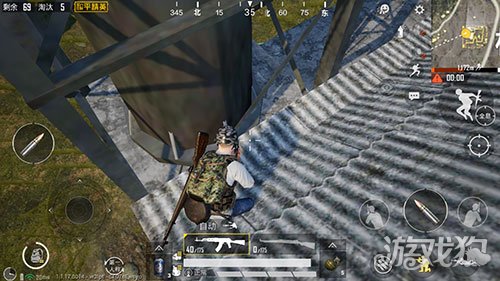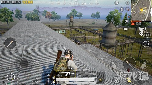 首先我们要到没有物资那一边的平台,然后图中这个位置,必须是要在靠最外面的位置,然后爬上去,上来之后蹲下走到靠近里侧的栏杆面前,来回多跳几次,就可以成功的爬上屋顶了,这里的视野非常好,而且敌人也不会猜到我们在这