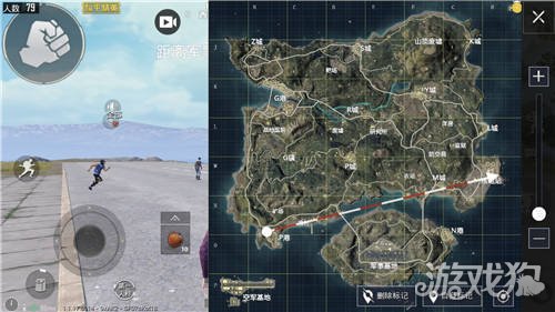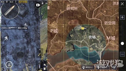 首先,在跳伞之前就要观看我们的飞机航线。这把的飞机航线距离军事基地很近,会有不少人去。有个冷知识,以这把圈刷离军事基地举例,就是第一个圈会刷离人多的地方,所以不选择军事基地。再看看航线附近的资源点,比较好的就是P城了,这把就飞P城了。