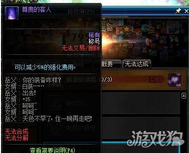 尊贵的客人这个称号的旁白看到就能感受制作者的生活,而且作为一个功能称号可以减少5%的强化费用,但是想要获得这个称号非常难,需要把一件装备强化15以上才行,大多数玩家哪怕是玩了11年也没有强化过15的经历,拥有这个称号的玩家估计不到1%。