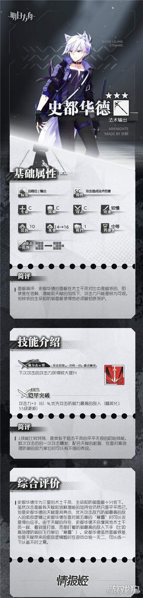 明日方舟术师史都华德测评,史都华德,行动预备组A4组员,谢拉格公民,正式任职前为自由职业者。于多项测试中获得优异成绩,逐被获准加入罗德岛,现于罗德岛行动预备组A4小组任职。