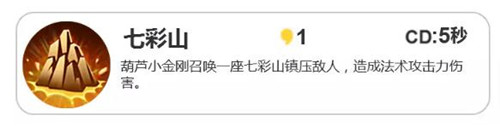 作为神秘的隐藏技能,葫芦小金刚召唤一座七彩山镇压敌人,造成100%(满级150%)的法术攻击力伤害。