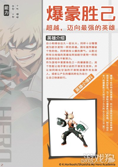 爆豪胜己的关键词就是火爆,他自小就拥有强悍的爆破个性,性格同样火爆到突破天际,战斗中“西内”更是口头禅。但意外的,看似非常无法冷静的他,在战斗时会冷静的分析对手和局势;因此其实是个非常可靠的少年。