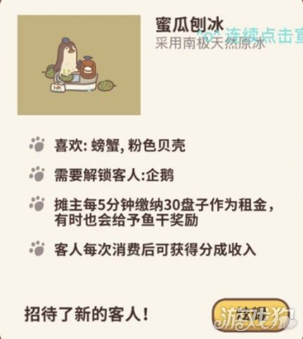 动物餐厅蜜瓜刨冰怎么解锁?动物餐厅鱼塘需要大家解锁不同的摊主,并且不同的摊主解锁方法也是不同的,小编今天带来的就是蜜瓜刨冰的解锁方法,还不知道蜜瓜刨冰怎么解锁的小伙伴们快来看看吧! 蜜瓜刨冰怎么解锁: 蜜瓜刨冰简介:采用南极天然原冰 。 喜欢:螃蟹,粉色贝壳 需要解锁客人:企鹅 摊主每5分钟缴纳30盘子作为租金,有时也会给予星星好评。 客人每次消费后可获得分成收入。 以上就是小编今天带来的关于动物餐厅蜜瓜刨冰解锁攻略的全部内容了,希望小伙伴们喜欢!