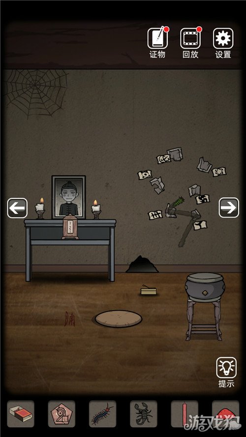 2.保姆房间灵堂场景,点击墙壁上的虫子,将之前得到了蛊虫培养液喂给它喝,再将前面得到的鼓放在盘旁边的鼓架上,开始进行为蛊虫和营养液的游戏。这个游戏是比较简单的,小伙伴们只需要准确的点击,让蛊虫喝到液体就可以了;