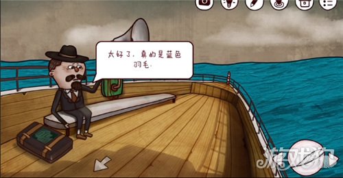 2.点击码头直接来到大船上面,点击甲板上之前遇见的商人, 就是需要蓝色羽毛的那个商人, 把之前得到的蓝鸟的羽毛给他,之后他会打开身边身边的盒子,点击盒子里面的物品,获得化石蛋;