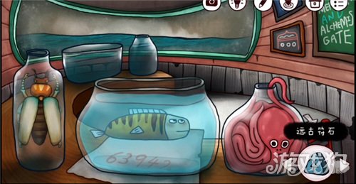 3.拿到化石蛋之后就可以来到船上的二楼了,点击二楼的密室里面,就是有睡着的鱼的那里,点击鱼缸左边的瓶子,把之前祭祀给的曼陀罗花放到瓶子里,里面的蜣螂吃完曼陀罗花之后,它的背上会显示出一些图案;