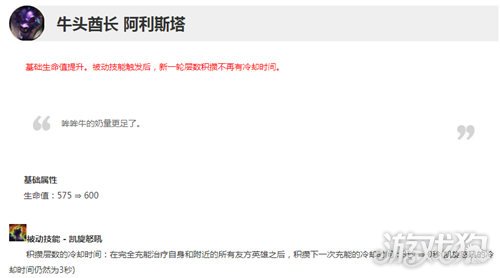 在10.5版本中,设计师加强了牛头的基础生命值以及他的被动技能的冷却时间也大大减少了,这就导致牛头在前期的坦度略微有了提升且在对线期的回复能力也是大大加强。被动技能现在充能不需要冷却,大大加强了下路的对线能力。