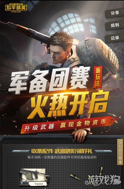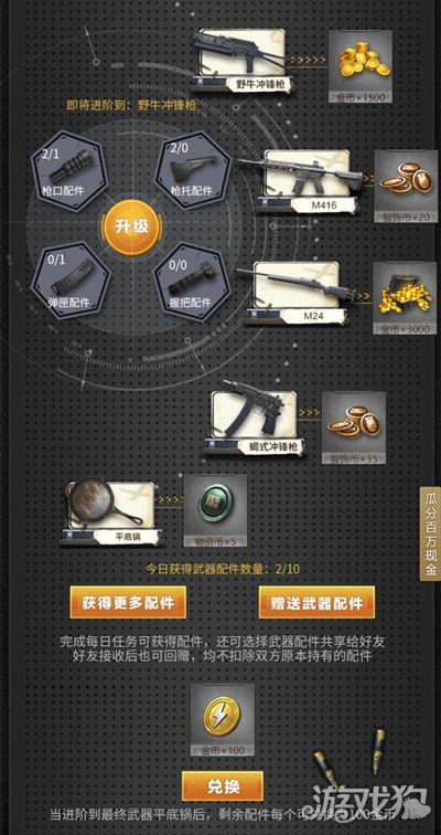 活动初始的武器是Vector,大家通过登录游戏、参与军备团竞或排位对局收集武器配件,逐步进行升级。武器升级的顺序是:Vector、野牛冲锋枪、M416、M24、蝎式手枪,最后是平底锅,每次升级后获得新武器就可以领取对应的奖励。收集的配件是枪口配件、枪托配件、弹匣配件、握把配件。比如从Vector升级到野牛冲锋枪需要两个枪口配件、两个枪托配件,升级成功可以获得1500金币奖励。最后升级到平底锅即能获得5个物资币哦!大家还可以和小伙伴们一起合作,收集到的武器配件可以相互赠送,但每日最多可以赠送两个。