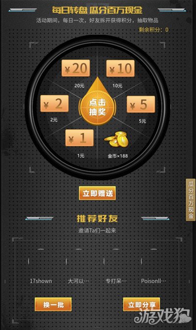 然后大家每天都可以相互分享赠送积分给好友,前五名点击分享页面的好友均可以获得1积分,积分就是用于现金抽奖的哦!点击转盘进行抽奖,奖励分为现金1元、2元、5元、10元、20元和188金币。大家抽取到现金一定要关注公众号“微信游戏”才可以领取现金哦!