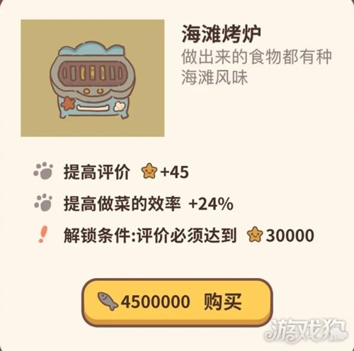 动物餐厅海滩烤炉设施怎么解锁,动物餐厅的设施有一定的条件才能解锁,并且不同的设施解锁方法也是不同的,小编今天带来的就是最新的海滩烤炉设施的解锁攻略,还不知道的小伙伴们快来看看吧! 海滩烤炉怎么解锁: 海滩烤炉简介:做出来的食物都有种海滩风味。 提高评价:加45星 提高做菜的效率+24% 解锁条件:评价必须达到30000星 5400000小鱼干购买 以上就是小编今天带来的关于动物餐厅海滩烤炉设施解锁攻略的全部内容了,希望小伙伴们喜欢!