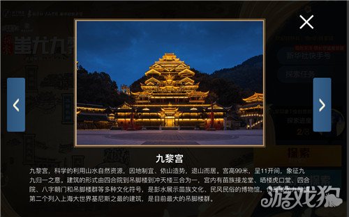 探索九黎城这个任务在和平精英活动中的限时板块中。从整体的宣传图中可以看到,这次的活动是和平精英宣传苗族文化的一个平台。玩家点击右下方的立即探索,会跳转到一个页面。然后玩点击探索之后,就能看到苗族的一些特色建筑的资料和介绍。