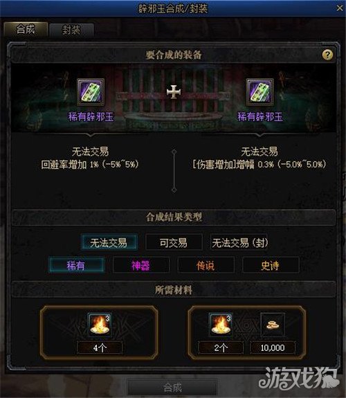 首先,小伙伴们要知道辟邪玉为什么要合成,辟邪玉一共有四种品质稀有、神器、传说、史诗,品质每提升1个等级,附加的属性就多一条。但是这个属性是随机获得的所以就需要我们通过合成去组合出我们想要的属性词条。